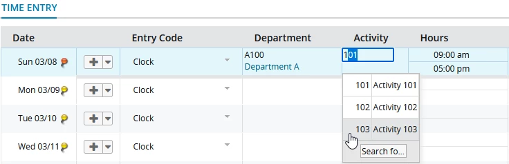 - Allow for easy selection of data at the TS. For example, allowing a user to select the Project or Cost Center for a specific time entry, or to specify their Department and Activity as seen in the example below.